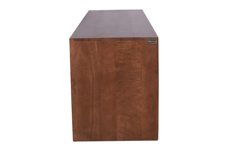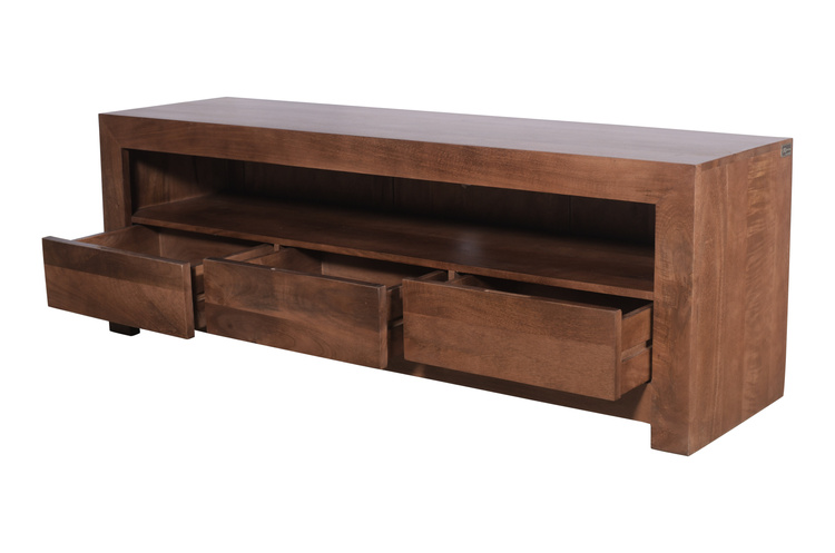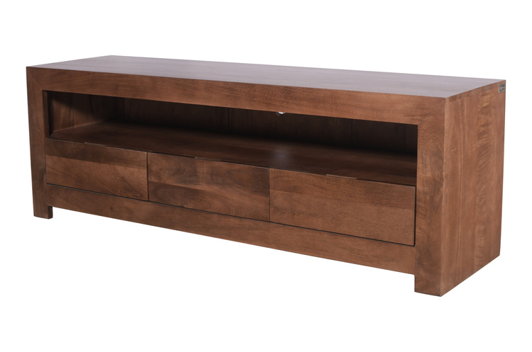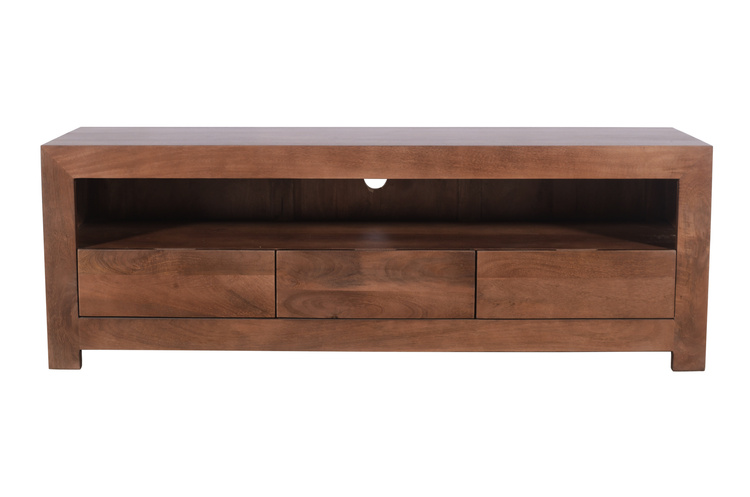 - Klasyczna szafka pod telewizor z trzema pojemnymi szufladami sprawdzi się w prostych aranżacjach wnętrzarskich. Mocna rama mebla oraz ciemny odcień drewna Mango sprawiają, że mebel będzie wyrazistym, zachwycającym punktem strefy kina domowego.