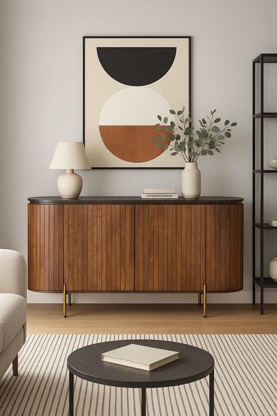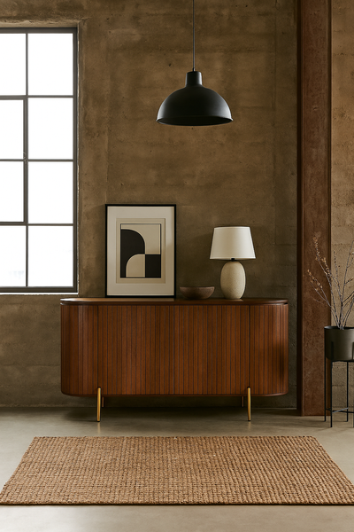 - Komoda reliefowana w pionowe pasy doskonale pasuje do nowoczesnych, modernistycznych wnętrz. Obły kształt wyróżnia mebel na tle pozostałych komód drewnianych. Metalowe nóżki w kolorze złotym komponują się z drewnem Mango w odcieniu orzecha włoskiego.