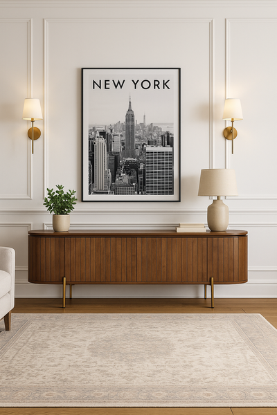 Drewniana szafka idealnie wpisuje się w estetykę classic modern, harmonizując z dodatkami w kolorze matowej czerni lub grafitowym, np. metalowymi lampami, ramkami czy współczesnymi rzeźbami. Z kolei zestawiona ze stolikiem kawowym i miękkim dywanem w odcieniach beżu wprowadzi modny kontrast tekstur między gładkimi powierzchniami a naturalnym drewnem.