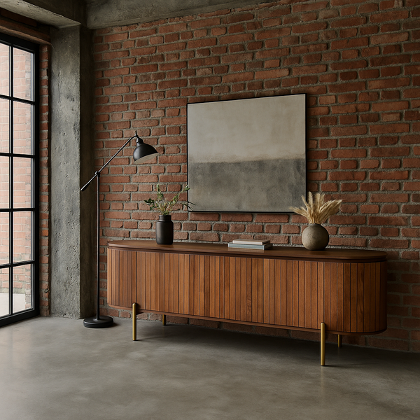 Drewniana szafka RTV z lamelami wykonana z litego drewna mango w odcieniu orzecha włoskiego prezentuje harmonijne połączenie naturalnej tekstury z nowoczesnym designem. Fronty z pionowymi lamelami tworzą charakterystyczną grę światłocieni, która dodaje meblowi elegancji oraz wyrazistego charakteru. Geometryczną formę łagodzą zaokrąglone boki, a także smukłe metalowe nóżki, wprowadzając do wnętrza subtelną miękkość oraz lekkość.